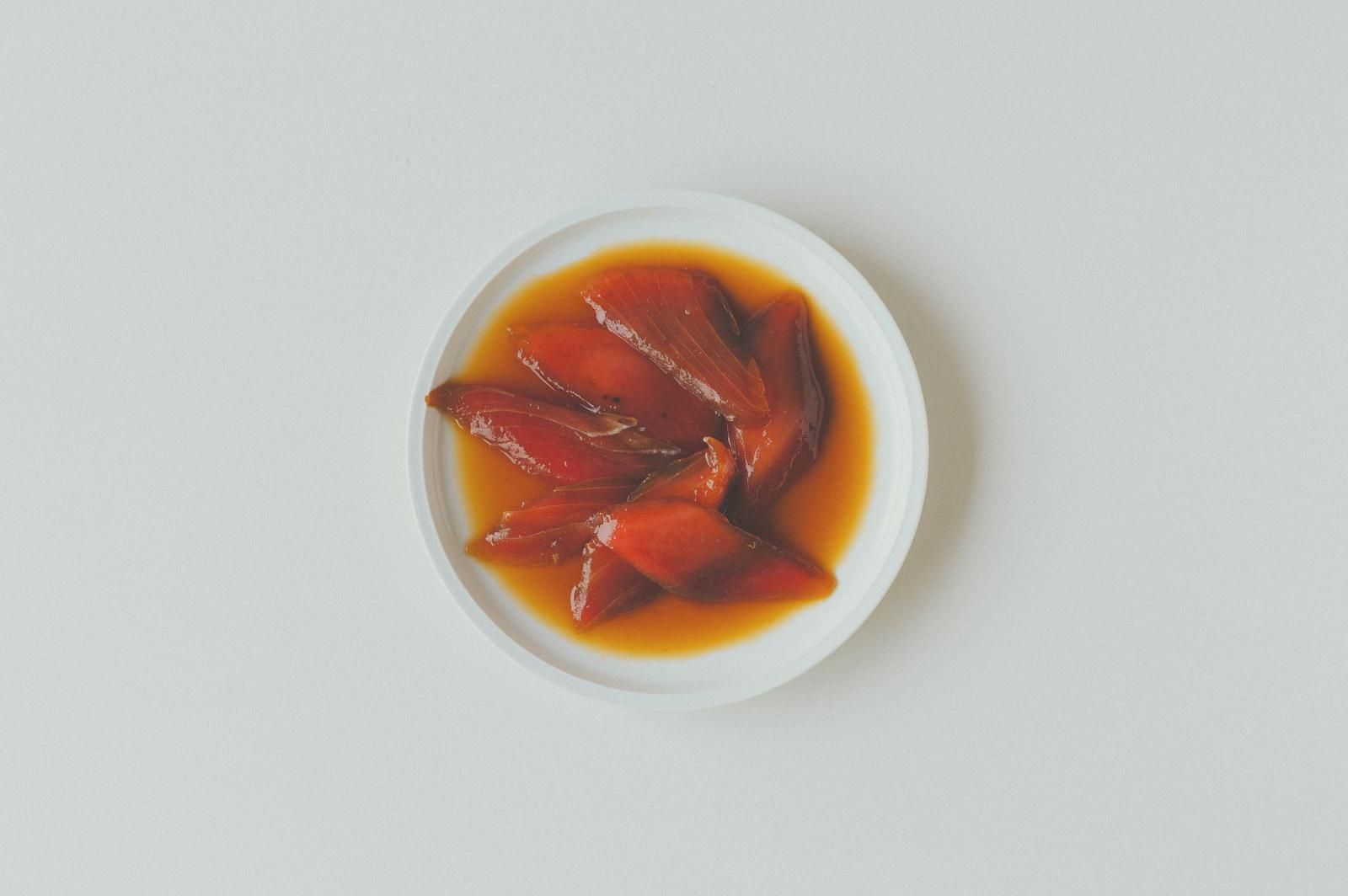 メバチまぐろの赤身の中でも、まぐろの旨みが感じられる濃くねっとりとした赤身質を目利き。赤身はすべて手作業で、食べ応えのある厚みに1枚1枚カットしていきます。 漬けダレに使用している調味料はこちら。 ・杉桶で天然醸造している「小豆島のお醤油」 ・伝統製法で作られている「三河の有機本みりん」 ・添加物を一切使用しない上質天然素材で作る「京都うね乃の出汁」 出汁をとり調味料と合わせるところから、すべて手仕込み。出汁の香りが効いたづけまぐろに仕上げました。
