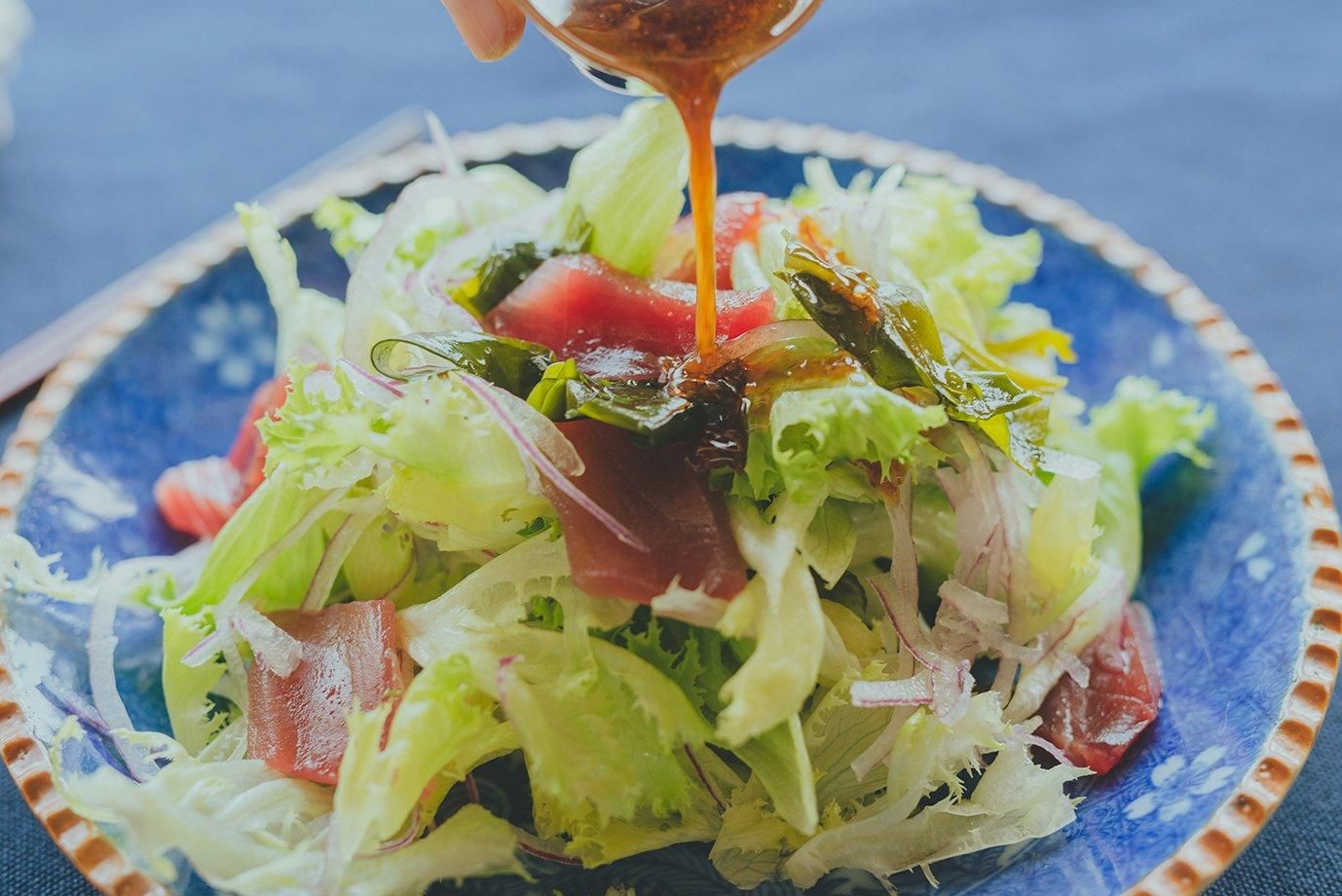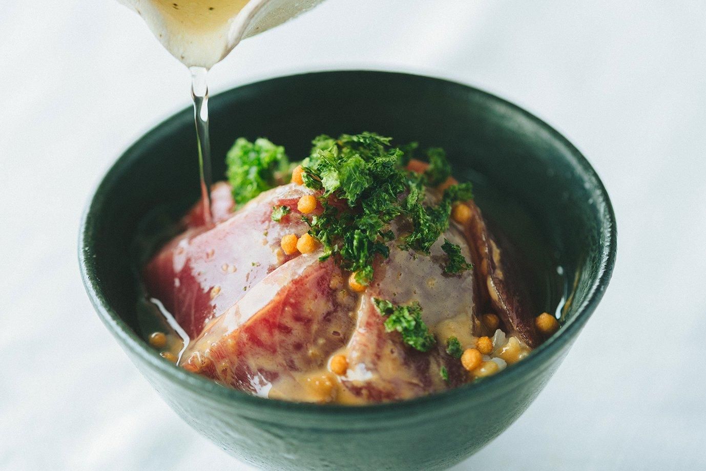 ゴマだれにからめたまぐろ丼に一番出汁をかけてお茶漬けに